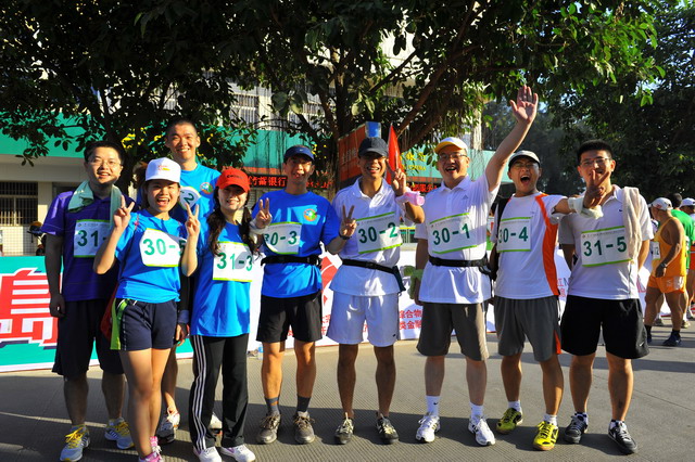 11月5日,秋陽燦爛,大家早已躍躍欲試,隊中負責后勤的我,早在比賽前夕就廣發(fā)注意帖:速干短褲、帽子、腰包、水杯、小方巾、鞋子等物品需必備;作為隊伍領(lǐng)頭雁的齊總則早已咨詢專業(yè)選手,提倡大家結(jié)合自己體力準備能量棒、巧克力等緊急能量品;隊長鄧總在了解路線和路況后,制定了“穩(wěn)重取勝”的戰(zhàn)略,采取了“準備活動做充足,先慢后快求適應(yīng),不因外因亂陣腳,敵疲我追求成績”的具體戰(zhàn)術(shù);隊伍中的另一名隊員則帶來了他專業(yè)的GPS定位手表,分時段匯報所走路程、當前速度適當與否,并提前告知提速準備;我們的女隊友亞梅,則一路保持微笑,緊跟隊伍,偶爾爆出的一些冷笑話,讓緊張趕路的我們倍感清爽。