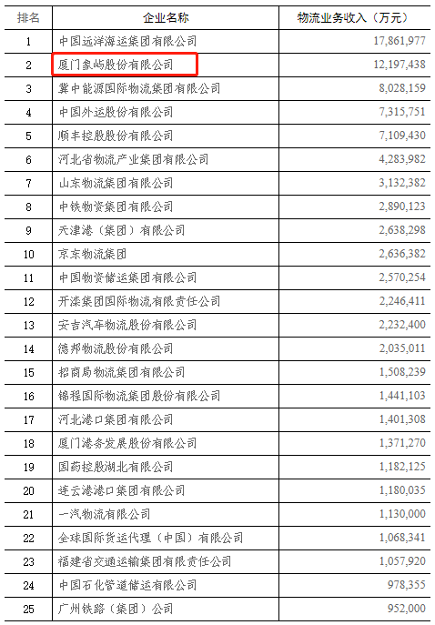 11月23日,中國物流與采購聯(lián)合會公布了2018年度中國物流企業(yè)50強排名,象嶼股份位列第2,較上一年前進兩位。